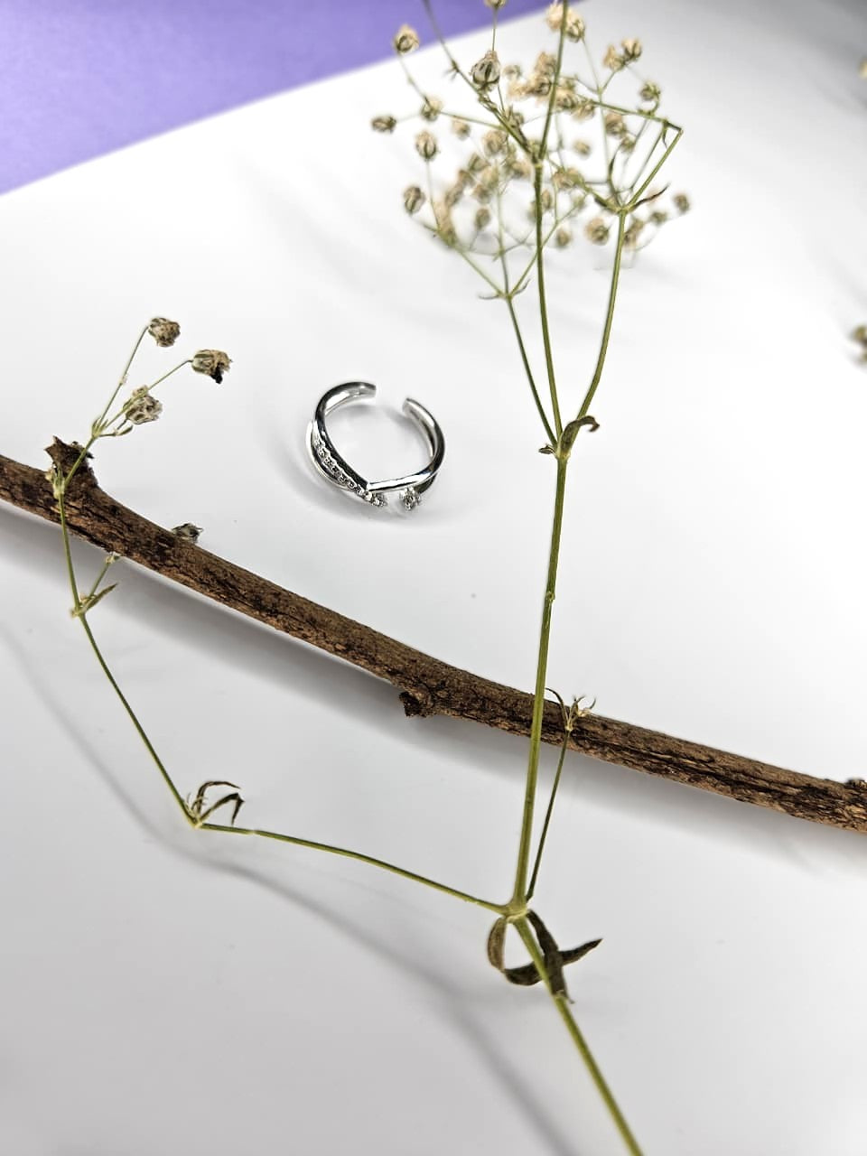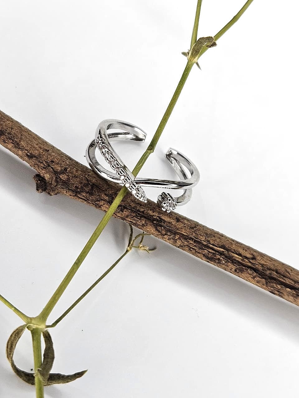 Discover modern elegance with this adjustable silver open-band ring, featuring overlapping polished bands and a row of shimmering stones for subtle brilliance. Designed for comfort and versatility, it’s the perfect everyday accent or special occasion standout